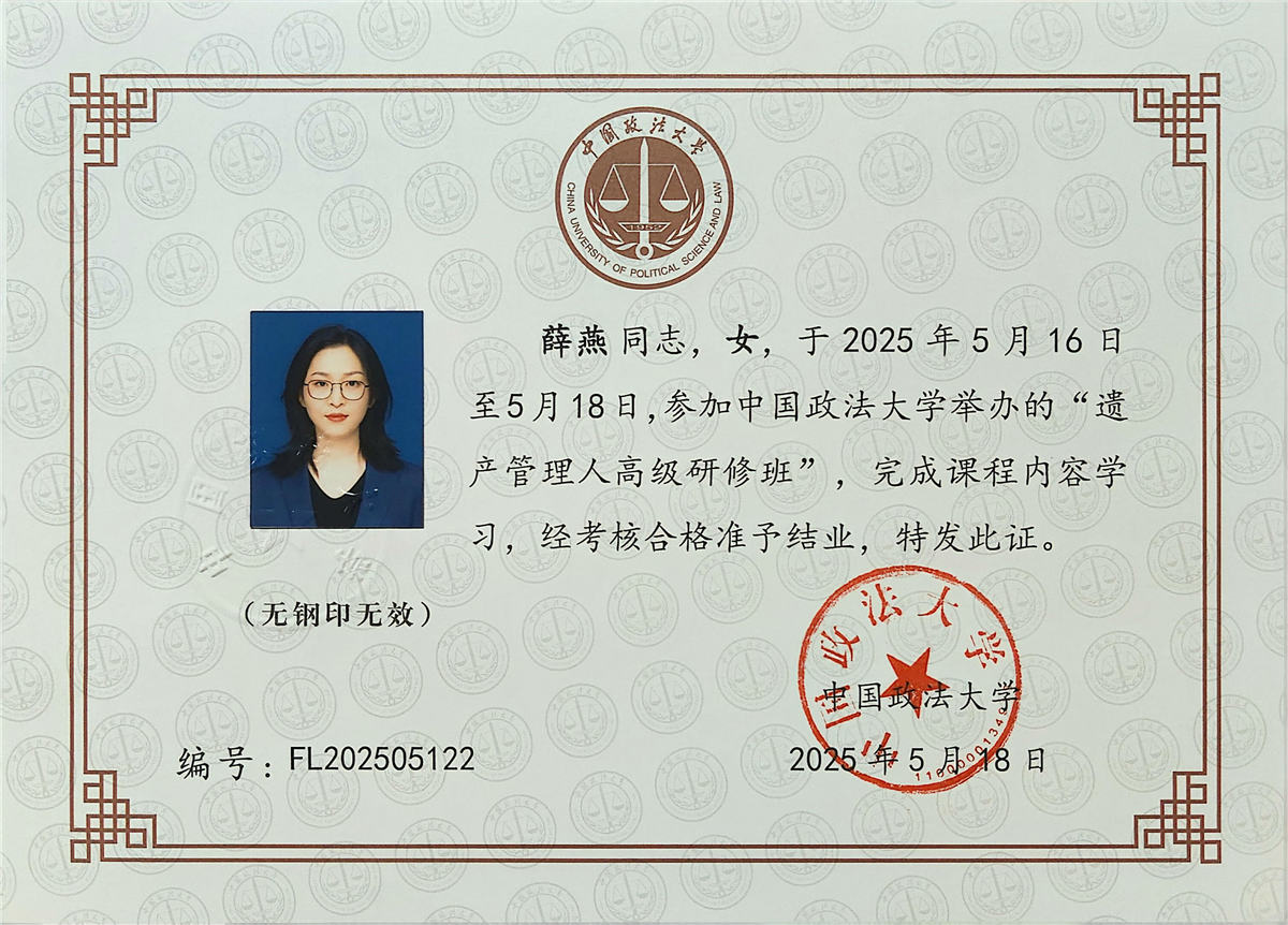 2025年5月16日,由中国政法大学法律学院举办的首届“遗产管理人高级研修班”在中国政法大学正式开班。我所薛燕律师通过本次“遗产管理人高级研修班”的学习,完成规定课时,经考核合格,于近日取得研修班结业证书和遗产管理师证书。